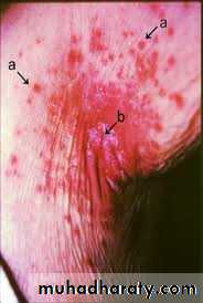 Intertrigo: (inguinal, axilla, under the breasts) erythematous patches, satellite papules and pustules