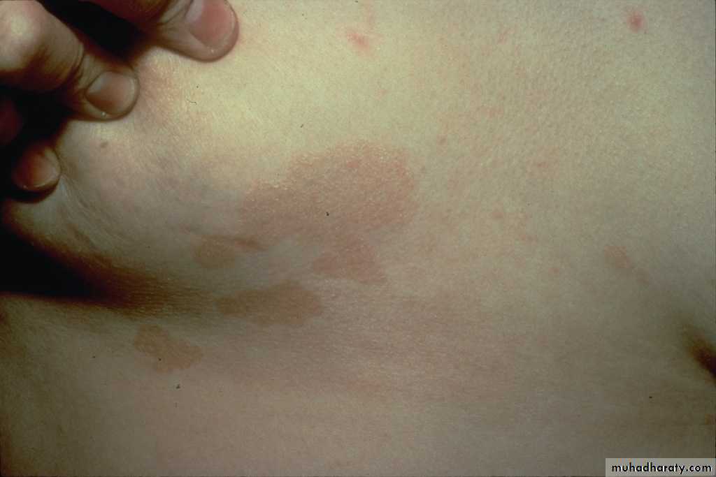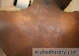 Pityriasis versicolor:Brownish or hypopigmented round patches, with fine scales