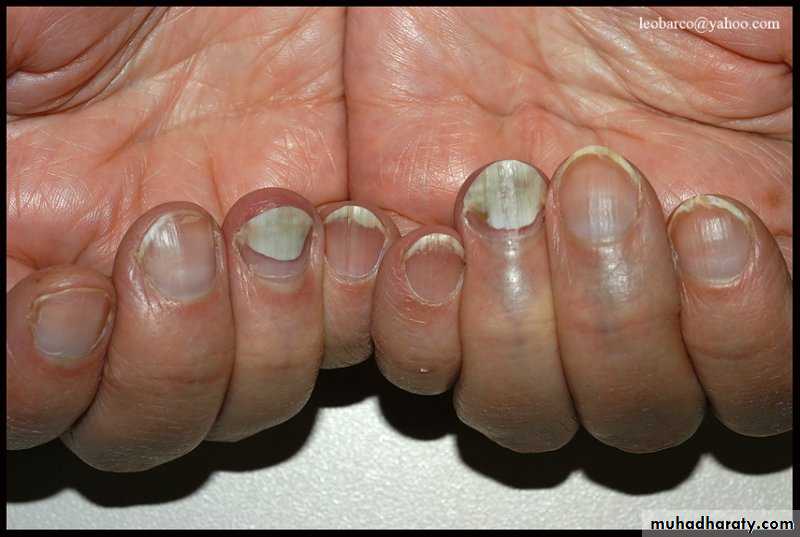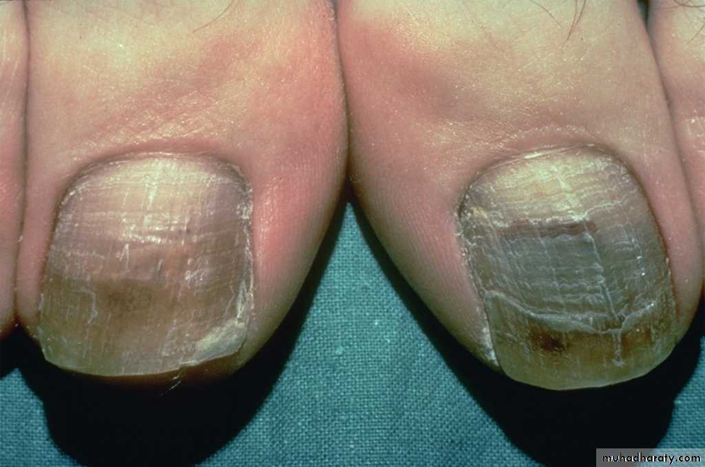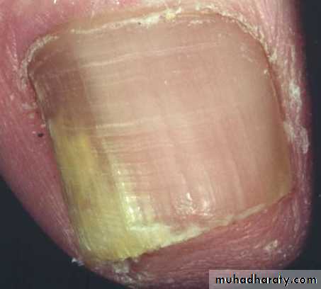 Toe nail more common than finger nail due to spread from a near focus of tinea pedisFree edge becomes yellow proximal invasion with darkening of color