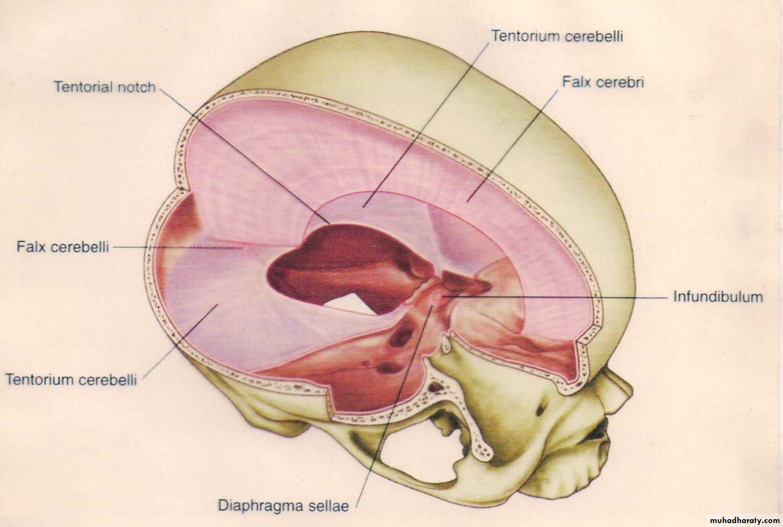 • 1-Falx cerebri: -Is sickle shaped fold occupying the median longitudinal cerebral fissure, between the two cerebral hemispheres, its pointed anterior end attaches to crista galli & internal frontal crest, while its broad posterior extremity fuses with the superior layer of tentorium cerebelli. The flax cerebri has an outer fixed convex border related to the inner aspect of sagittal suture, while its inner border is free & related to corpus callosum (which connects the two cerebral hemisphere) at the bottom of the cerebral fissure.