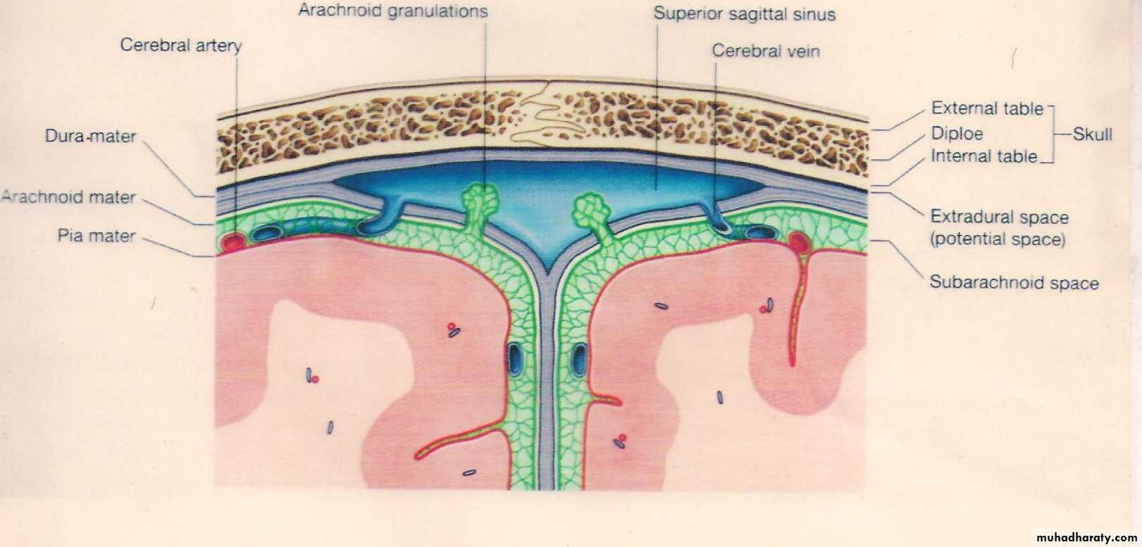 أ.د.عبد الجبار الحبيطيThree membranes cover the brain & the spinal cord. They are arranged as outer dura, and then arachnoid & inner layer is the pia mater. The cranial dura mater is formed of two layers, an endosteal & Meningeal (the dura of the spinal cord is only one layer). The two layers are firmly fused together, except at certain sites where they separate to enclose between them venous sinuses.