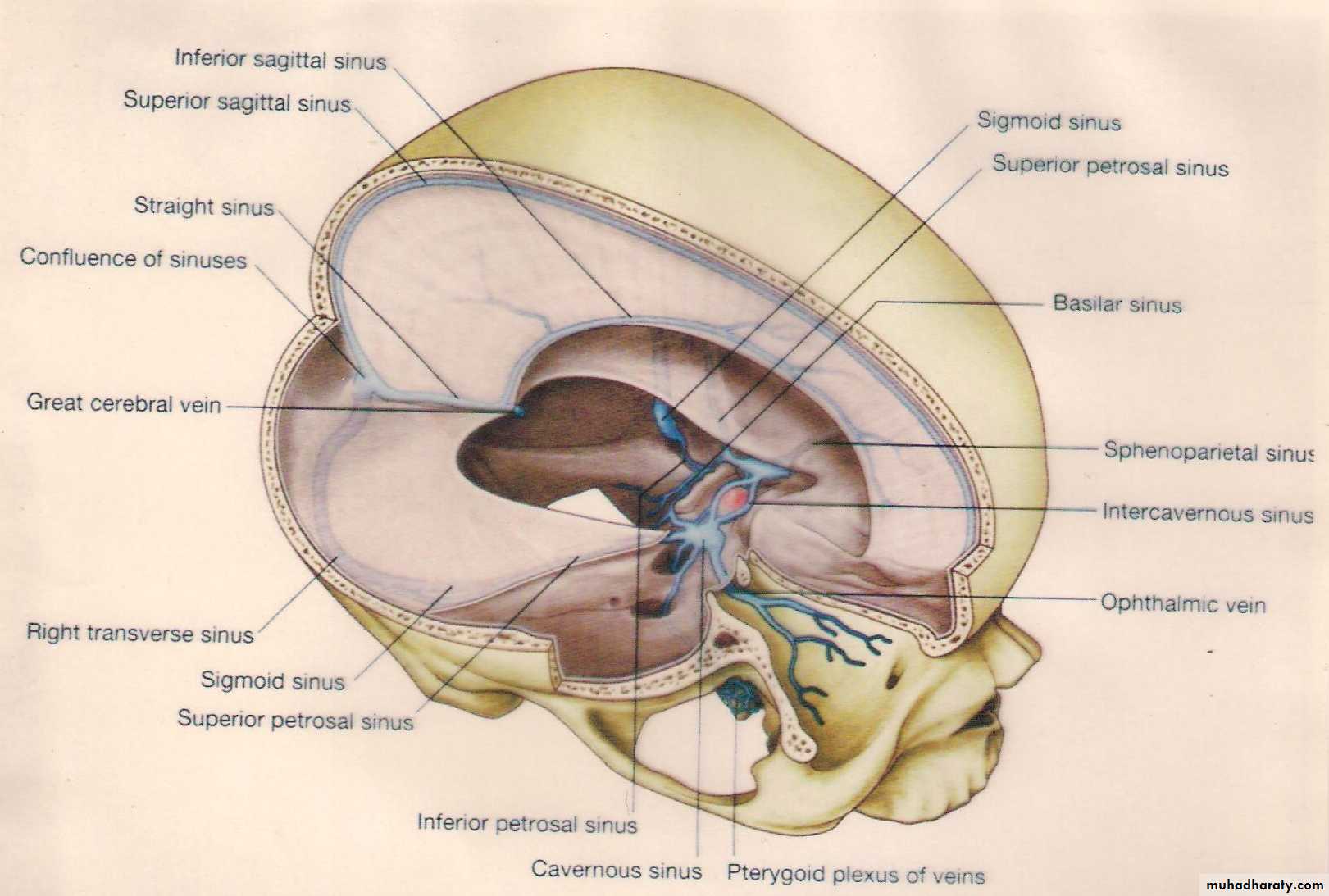 • Transverse sinus: - lies in the attached border in the groove for transverse sinus on the circumference of occipital bone from inside.