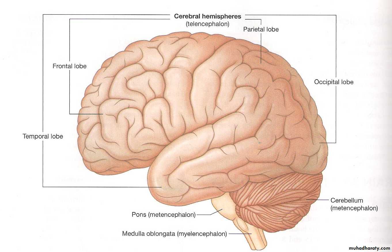Each hemisphere consists of an outer layer of gray mater (cortex) which is thrown into sulci & gyri to increase the surface area of the cerebrum & an inner white mater ( medulla) which contains nerve fibers (axons & dendrites) arranged as fibers of different kinds, namely associated commissural & projecting fibers with supporting element of neuralgia. Inside the medulla we can see scattered small masses of gray mater dispersed as island inside the white mater known as basal ganglia (or nuclei). In addition each cerebral hemisphere has its own cavity called as lateral ventricle with its four parts; anterior horn (for the frontal lobe), body (for parietal lobe), posterior horn (for occipital lobe) & inferior horn (for temporal lobe). The cortex (gray mater) contains the bodies of neurons (nerve cells) & the supporting element of neuroglia.