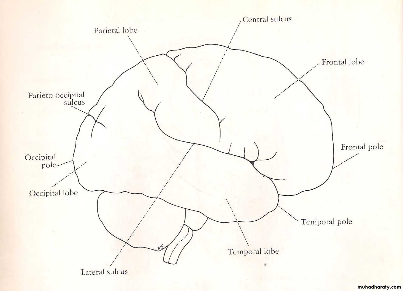 - consist of two hemispheres separated from each other by the median longitudinal cerebral fissure (which contains the falx cerebri), at the bottom of the fissure, the two hemisphere are connected together by what is called the corpus callosum (a kind of commissural fibers), each hemisphere consist of four lobes: - frontal, parietal, temporal & occipital, with three poles: - a frontal, temporal & occipital poles. Each hemisphere extends from the frontal bone anteriorly as far as the internal occipital protuberance posteriorly. Where the occipital lobe is separated from cerebellum by the tentorium cerebelli.