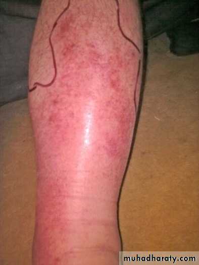 Cellulitis Infection of the deep subcutaneous layer of the skin Presents as a hot, tender area of confluent erythema of the skin Can cause systemic infection with fever, headache and vomiting. Erysipelas is more superficial and has a more well demarcated border