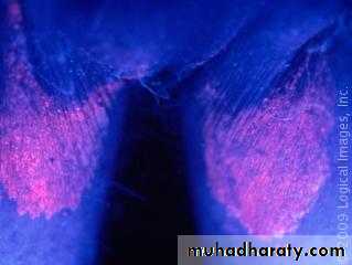 When you use the Wood’s light, the skin lesionshows a dramatic coral pink fluorescence.
