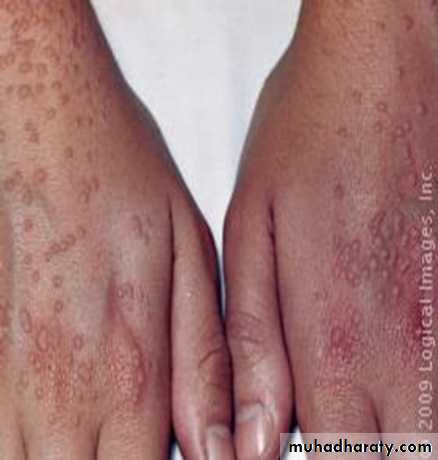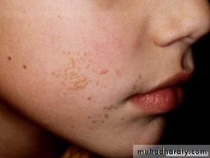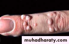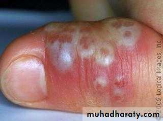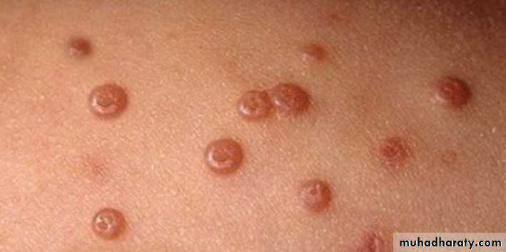 Molluscum contagiosum Caused by MC virus Common in children, but can occur at any age Spread by direct contact Presents as multiple small, pearly, dome-shaped papuleswith central umbilication Can occur at any site Usually resolve spontaneously in 6-18 months Resolution is heralded by the development of erythemaaround the lesions. Treatment is not usually necessary – simple reassuranceand advice about reducing transmission. If treatment is necessary, options include: Piercing the lesion with an orange stick tipped with iodine Curretage imiquimod cream