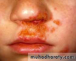 Impetigo A highly infectious skin disease, which commonly occurs in children. The causative organism is usually Staphylococcus Aureus (>90% cases1), but less often can be strep pyogenes. Begins as a vesicle, which may enlarge into a bulla. Weeping, exudative area with characteristic honey coloured or golden, gummy crusts, which leave denuded red areas when removed. May present as macules, vesicles, bullae or pustules Bullae are more prominent in staphylococcal infection and in infantsImpetigo