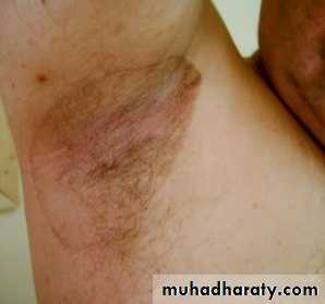 Erythrasma Colonisation of axillae or groin with Corynebacterium Minutissimum. Presents as a fine, reddish brown rash in the flexures, which is sharply marginated. Often misdiagnosed as a fungal infection Woods light illumination produces acharacteristic coral-pink fluorescence. Treatment is with topical fusidin cream