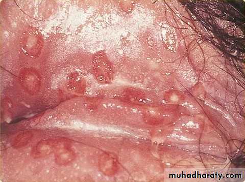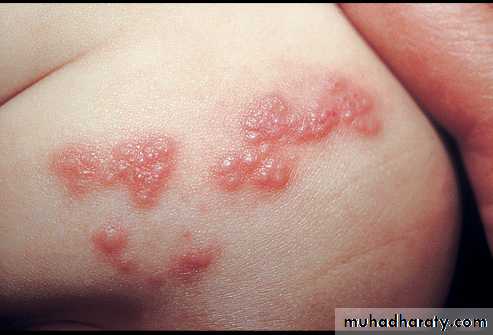 Herpes Simplex Virus A highly contagious infection spread by directcontact HSV 1 : also commonly called “coldsore” HSV 2 usually presents on the genitalia Primary infection is usually asymptomatic. Recuurent infection presents as acute, painfulgingivo-stomatitis with multiple small intra/perioral ulcers (but any site could be affected).Associated with fever, malaise andlymphadenopathy. Clinically: Grouped umbilicatedvesicles/pustules on erythematous base.
