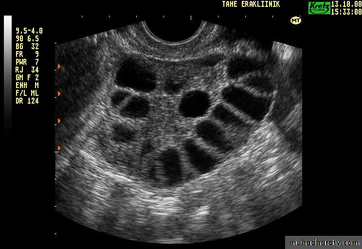 Ultrasound: increased stromal thickness and increasedovarian volume (>10 cm3)(specific for PCOS),and the