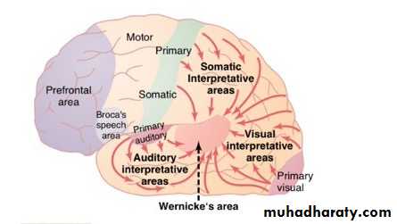 It is the hearing area, Posterior to auditory area is most important area of the entire brain which responsible understanding and comprehension of spoken and written language this area was discover by German neurologist and called in honor of his name Wernicke's area, he was interested in aphasic patients (difficulty in speech)and use to do post mortem to his patient, he have had found in all of his patients were having some damage in the same area that is called (Wernicke’s area). This area is located in the left hemisphere at the point of junction parietal ,occipital and temporal lobes so it receives information from all of these areas the sensory information after pre analyzed will be sent to the Wernicke’s area for the production of ideas and to choose the word to be used in expressing the idea.