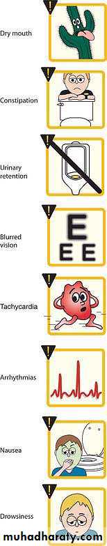 The TCAs block muscarinic cholinergic receptors, and can thereby cause anticholinegic effects( dry mouth, blurred vision, photophobia, constipation, urinary retention, and tachycardia).