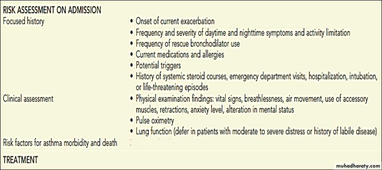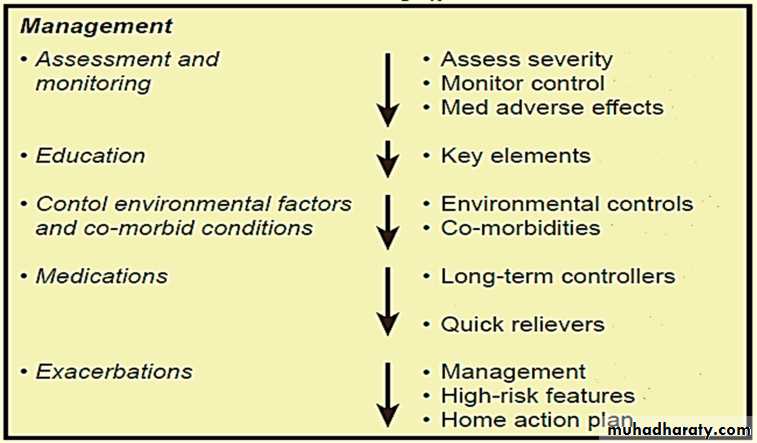 The primary goals of asthma management include correction of hypoxemia, rapid improvement of airflow obstruction, and prevention of progression or recurrence of symptoms.Indications of a severe exacerbation include:
