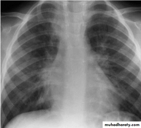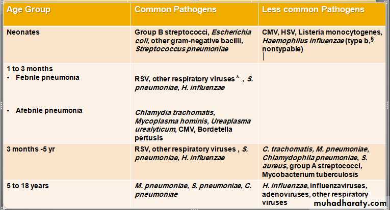 Viral pneumonias: are associated more often with cough, wheezing, or stridor; low fever. Hyperexpansion cause low diaphragm or liver. Sign of consolidation diffuse.