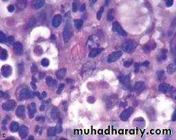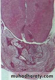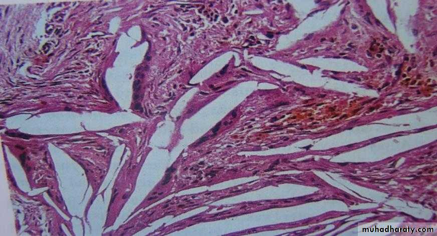 Within the cyst capsule there are often areas split up by fine needle-shaped clefts.These are left by cholesterol dissolved-out during preparation for sectioning.The cholesterol is derived from breakdown of blood cells.