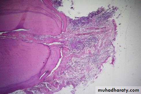 With progression, slight widening of PDL, lamina dura may become less defined.Histopathological features: