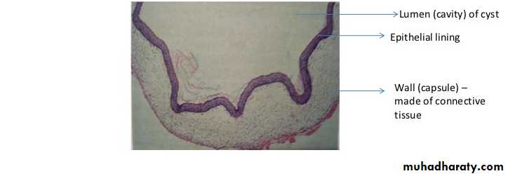 Long-standing cysts typically have a thin flattened epithelial lining, a thick fibrous wall and minimal inflammatory infiltrate.