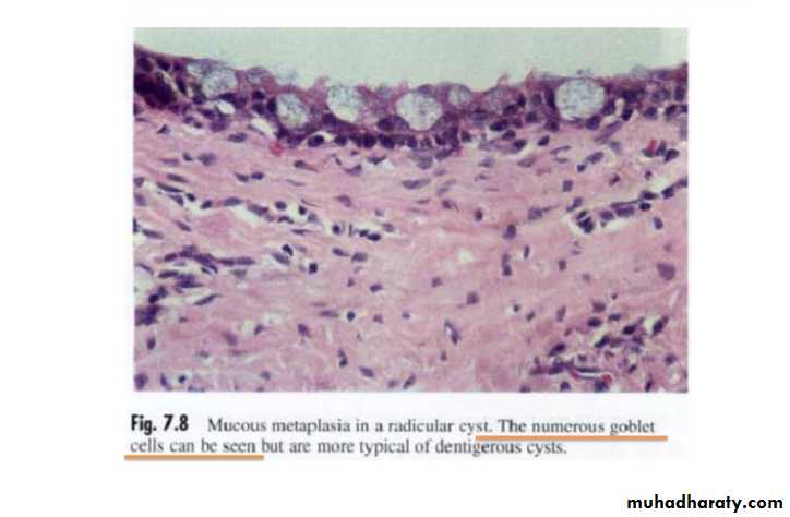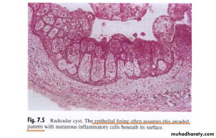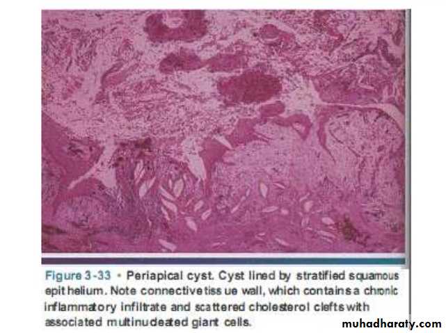 Histological Features.The epithelium lining the apical periodontal cyst is usually stratified squamous in type .