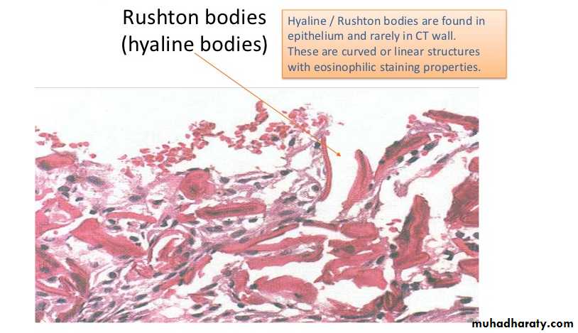 Hyaline bodies may be seen in the epithelium and mucous cells are often present as a result of metaplasia.
