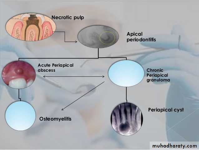 • Granuloma may continue to enlarge asymptomatically with continued bone and/or root resorption.• Suppuration and formation of an acute periapical abscess.
