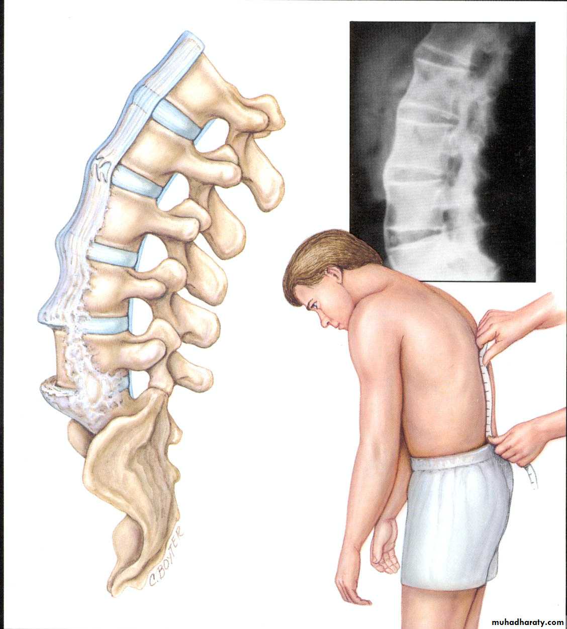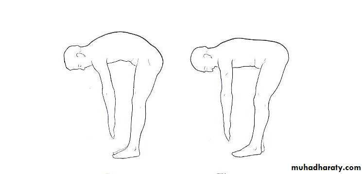 Instruct the patient to stretch his fingers towards hIs toes, keepIng the knees straight.It is important to Judge what proportion of the movement occurs at the spine and how much IS contrIbuted by hIp flexion Some patients can almost reach their toes, despite a stiff back,