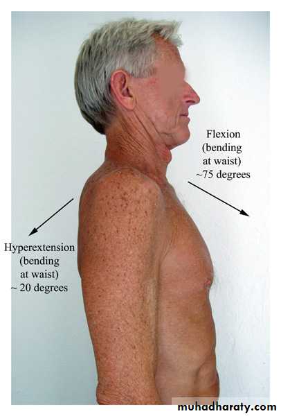 Instruct the patient to arch the spine backwards, lookIng up at the ceiling.Judge the range and express approximately as a percentage of