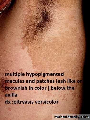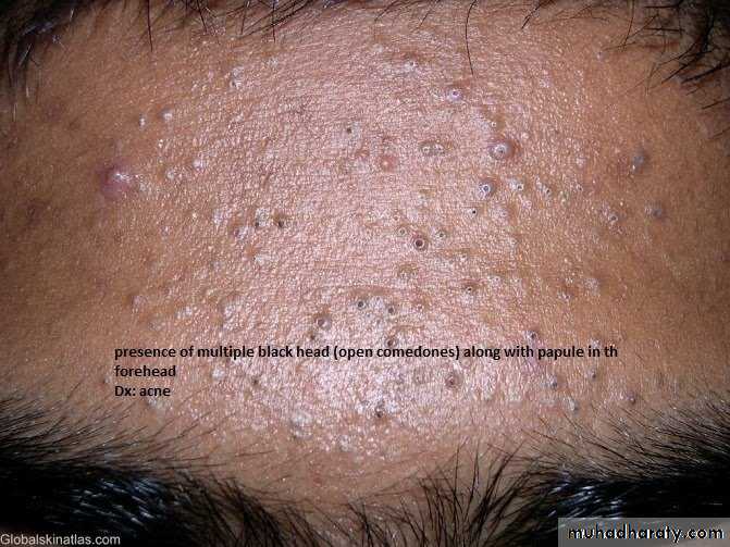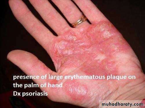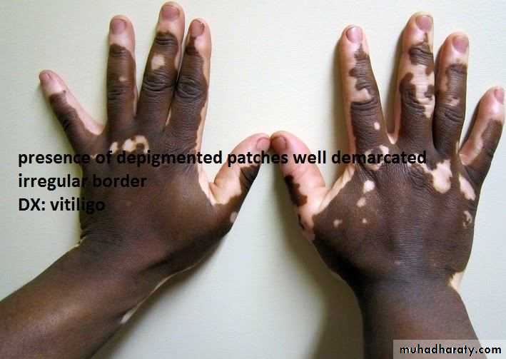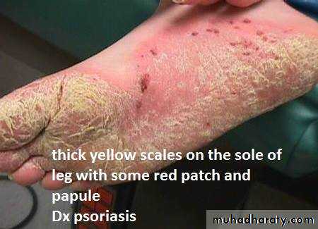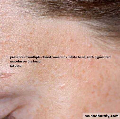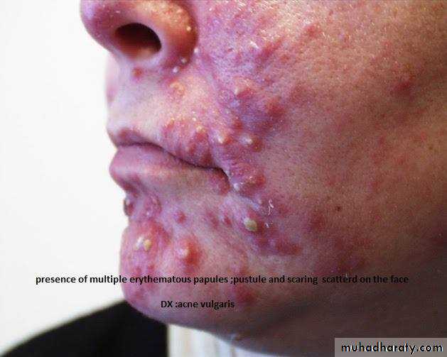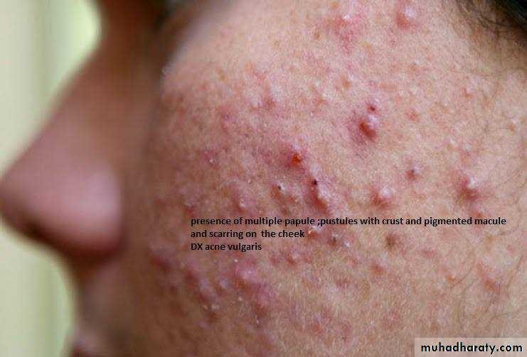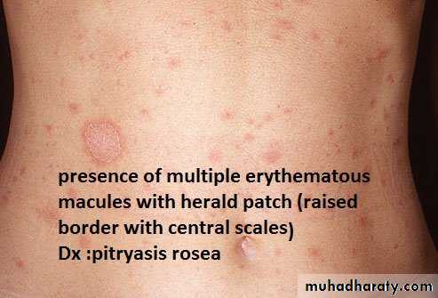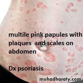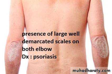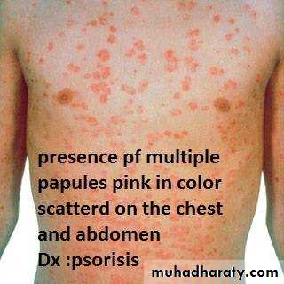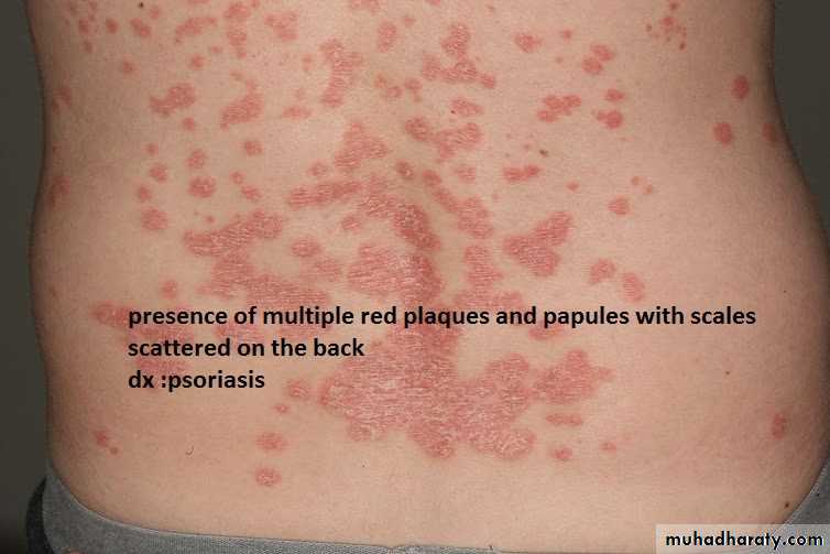 1-type of lesion : primary or secondary or both >>papule, macule ,plaque ,patch ,pustule ,crust ,,ect2-single or multiple 3-color of lesion :red , brown , purple ect4-shape : round or oval or irregular 5-surface : rough or smooth5- site of lesion : abdomen ;scalp ;hand ect