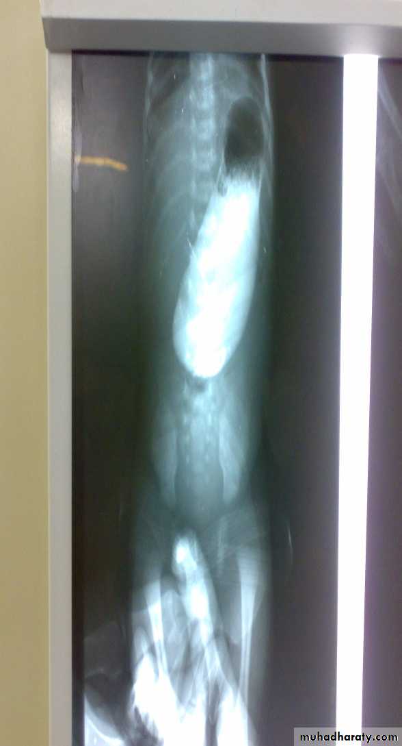 • Ba-meal dilated stomach – failure to pass to intestine – string sign