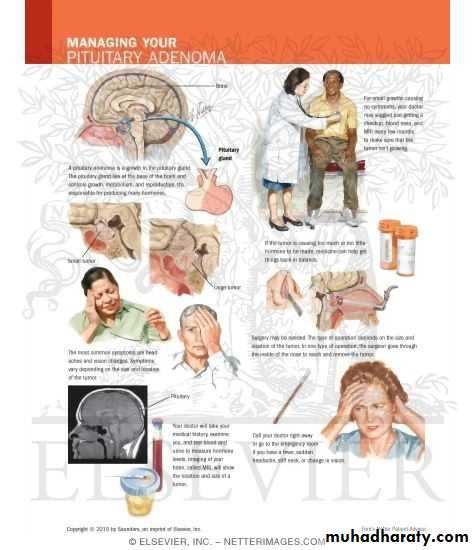 Chromophobe aedenomas(80%): presented by picture of hypopituitarism due to the destruction of the pituitary gland. and visual disturbance : bitemporal heminopia due to tumor compression on optic chiasmaChromophil adenomas ( 15% ): these are secretary tumors can lead to gigantism in childhood or acromegaly in adults