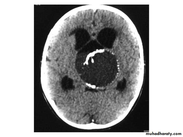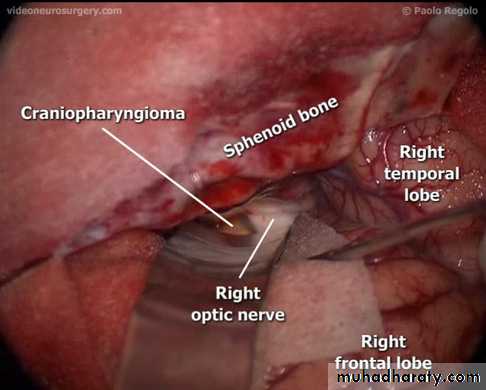 Craniopharyngiomas: arise from the remnant of the buccal ectoderm of the pharyngeal pouch , can present at any age 90% are cystic containing dark brown fluid like engine oil , full of cholesterolclinically presented by visual disturbances as bitemporal hemianopia with hydrocephalus