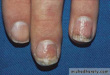 • Onycholysis: Separation of the nail plate from the nail bed.