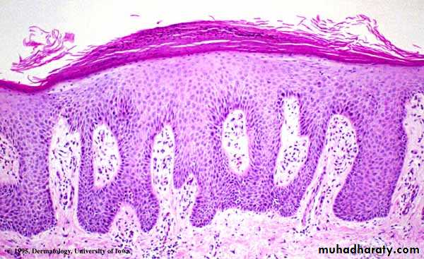 • Hyperkeratosis &Parakeratosis.• Absent granular cell layer