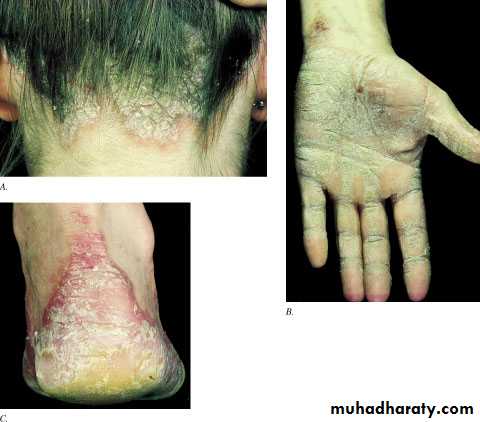 • scalp is often involved.• Asymptomatic or mildly itchy