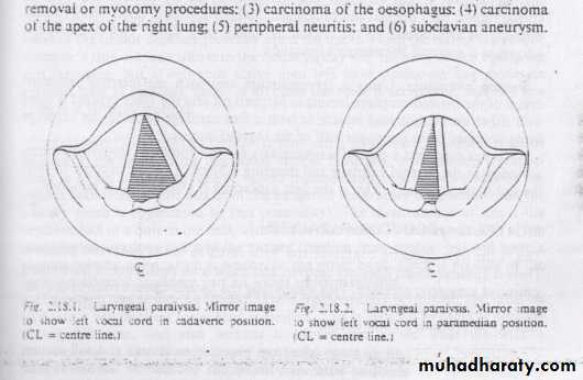 The chance is twice for the left recurrent nerve to be paralyzed than the right. Bronchogenic carcinoma is an important cause of left recurrent paralysis and should always be excluded by X-ray chest, bronchoscopy and biopsy.
