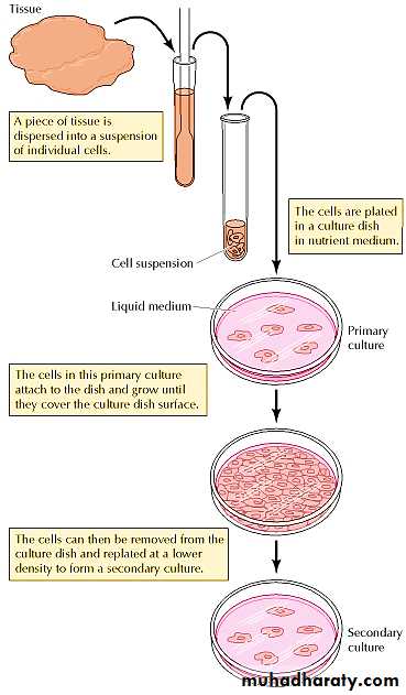 The initial cell cultures established from a tissue are called primary cultures .The cells in a primary culture usually grow until they cover the culture dish surface. They can then be removed from the dish and replaced at a lower density to form secondary cultures.