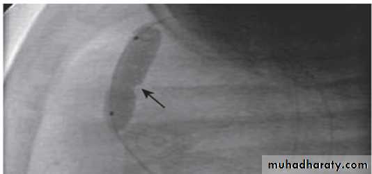Inflation of the balloon catheter showing the indentation (arrow) made on the balloon from the stenotic valve.