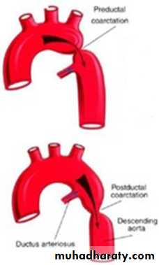 Infantile type (preductal CoA).Adult type (juxtaductal CoA) previously known as postductal type.