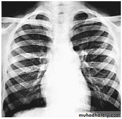 the heart size is usually normal (but may shows cardiac enlargement with prominence of the right ventricle and right atrium).
