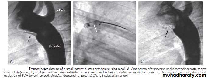 PDA requires surgical or catheter closure. Most PDAs can be closed in the catheterization laboratory by either coil embolization or a PDA closure device.