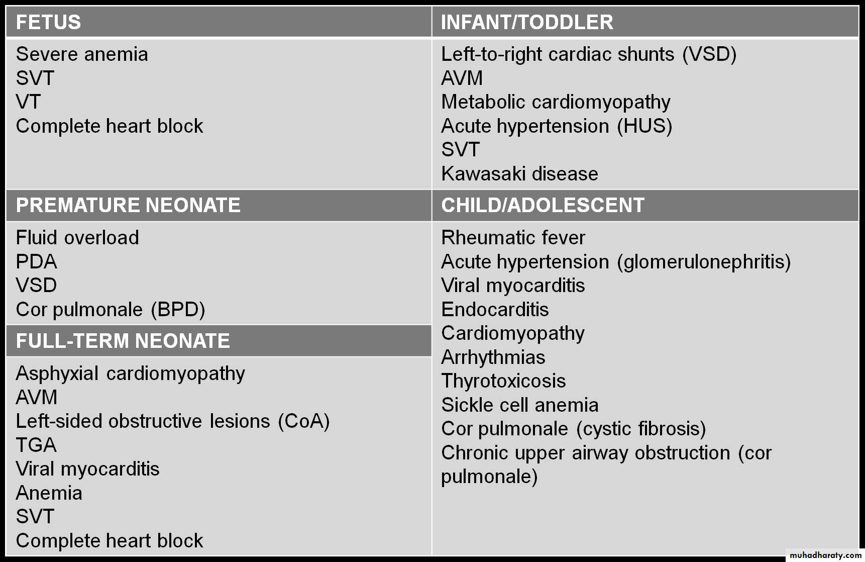 It is helpful to approach the differential diagnosis of heart failure based on age of presentation.