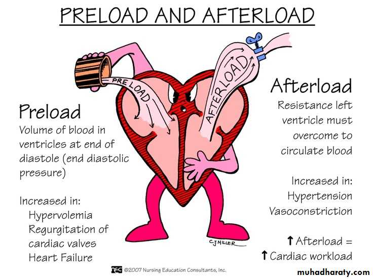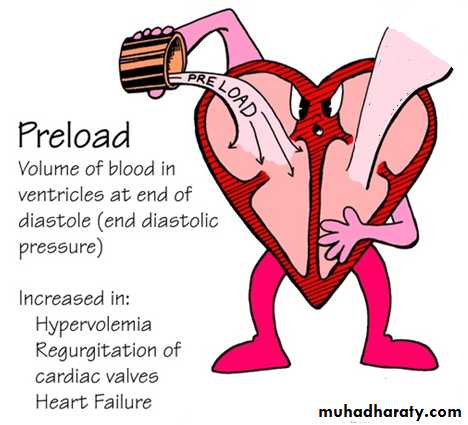 preload (volume overload, such as in VSD, PDA, or valvular insufficiency).