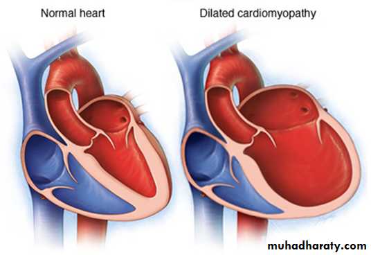dilatation of left atrium and left ventricle ± right ventricle.