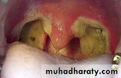 The disease is characterized by the appearance of a membrane on the tonsils, soft palate and posterior pharyngeal wall. The disease may spread to affect the nasal cavities and nasopharynx. The membrane is usually grey in colour, firmly attached to the mucosa and leaves a bleeding surface when it's removed.