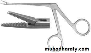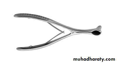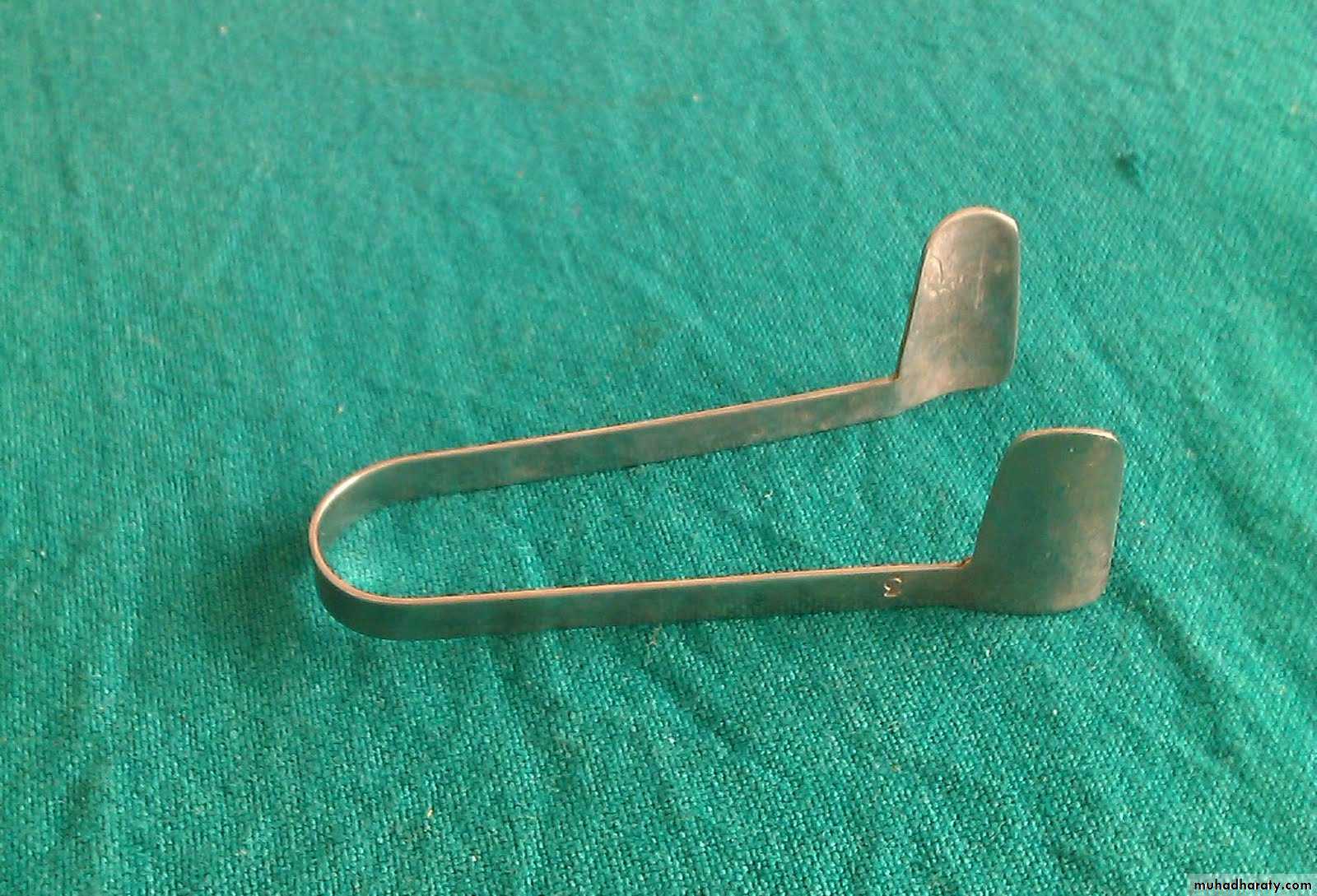 the joint is proximal. It is used for insertion of wick inside the ear ( ear dressing ) in cases of otitis externa and during ear surgery.Crocodile ear forceps : note that the joint is distal. It can be introduced through the aural speculum and used for removal of certain types of foreign bodies and biopsy.+packing+narrowing space of ear