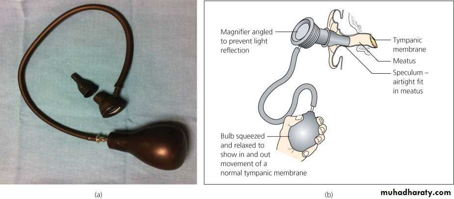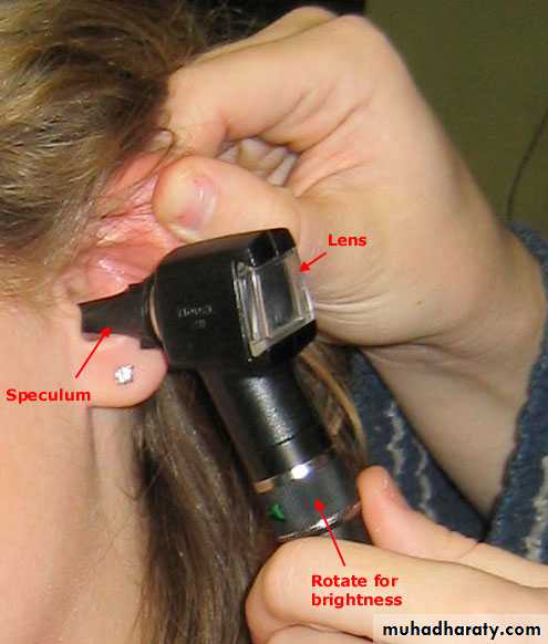 Examination of external ق ear(with head light or mirror)+pinna is pushed upward,outward and backwardAuroscope ( otoscope )