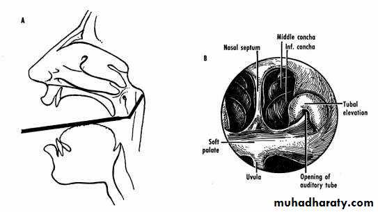 Steps:1-warming of the mirror to avoid fogging.3- introduced behind the soft palate to reflect the image of nasopharynx.2- The tongue is depressed by tongue depressor. This procedure is called posterior rhinoscopy(it is used for posterior rhinoscopy)