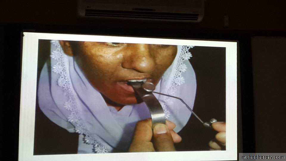 Indirect laryngoscopy is done after 1-warming the mirror ( to avoid fogging) and after 2-pulling the tongue by a piece of gauze. 3-insertion of the mirror 4- direct light 5-ask the patent to say eeee and watch focal cords.