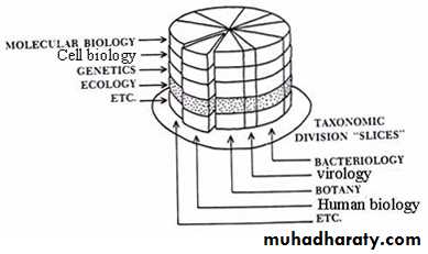 Biology scope Biology is very broad field, it encompasses a spectrum of disciplines, & sub disciplines, look at biology divisions, we traditionally cut biology "Layer cake,” to pieces in two distinct ways, fig. 1-1 it may be divided “horizontally" to "basic “divisions, because they are concerned with fundamentals common to all life or not restricted to a particular organism, e.g. molecular biology, cell biology, genetics, ecology, physiology, morphology, evolution............ etc & may be divided "vertically" to "taxonomic “divisions which deals with, molecular biology, cell biology, genetics. etc. of a specific organism, these disciplines are grouped by organisms being studied: e.g. microbiology, zoology, botany… etc