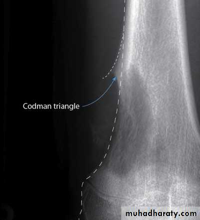 Subperiosteal new bone formation sometimes in the form of Codmen’s triangle and/or sun burst appearance.